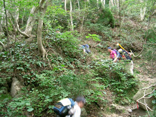 チャレンジ比良2004 3コース上級10km イン谷口・ダケ道経由・北比良峠・金糞峠・打見山 2004年10月3日(日) 曇り 滋賀の気温22度くらいか!山頂は風が冷たい。 池田駅4:59→梅田5:24 大阪5:41→京都6:27 6:36→比良7:13 比良駅で、受付。 受付NO 104 バスでイン谷口まで。もちろん、乗り物は参加費 2000円に含まれている イン谷7:30→北比良峠9:13→金糞峠9:36→荒川峠10:20→葛川越 10:57→比良岳11:10→木戸峠11:36→打見山11:51 →ゴンドラ山麓駅 12:03→無料ぜんざい食す→バスで志賀駅へ 志賀駅発12:59→ 池田宅15:45 ・ 待ちに待った「チャレンジ比良2004」 ・ イン谷口までは久々の江若バス。懐かしいな〜 イン谷を7:30出発 こんなに早いのは初めて。 ・ 先月同じコースを試しているので不安なく高度を稼ぐ。あっという間に北比良峠。スタッフの人も多く初めての 人も迷うことはないな。 ・ 時間が早いので休憩は取らず、先へ進む。 ・ 雲行きが怪しくなり、雨模様、小雨降る。たいした事はない。 ・ 途中、渋滞気味になったがそれもここちよい。 ・ 木戸峠までもあっという間だった。まだ、お昼前。先月はスキーコースを打見山山頂まで登ってこれが結構しんどかったが、今回はリフトで山頂へ。楽だ。 ・ 山頂からはゴンドラで一気に山麓駅まで。そこにはゴールが。そして無料ぜんざいが振舞われていた。これが かなりうまい。御代わりしようとおもったが遠慮してしまった。バスの出発の時間も結構あったので食べればよか った。バスは行ったばかりで人が集まらないと出発しない。ちょっとロスだな。 ・ いつもよりかなり早い時間に帰れた。 ・ チャレンジ比良はあっけなく終わってしまった。最後はもう少し盛り上げてもいいのに。 ・ 何となく集まり、何となく帰ってしまう感じ。 来年はどんなコースか・・・ ・ しかし、ぜんざいはうまかったぜ! PS 青ガレは通行止めのようだ。かなり崩れているようだ! |